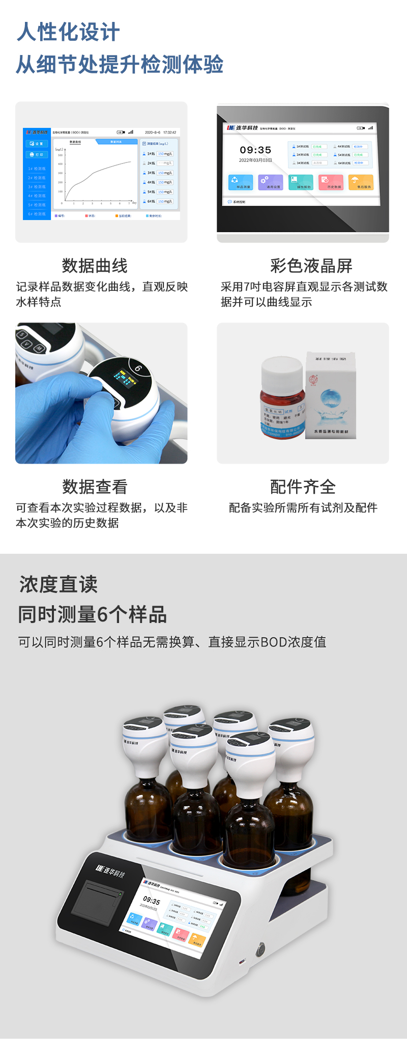 6、 濃度直讀:可以測量1-6個樣品,無需換算、直接顯示BOD濃度值;