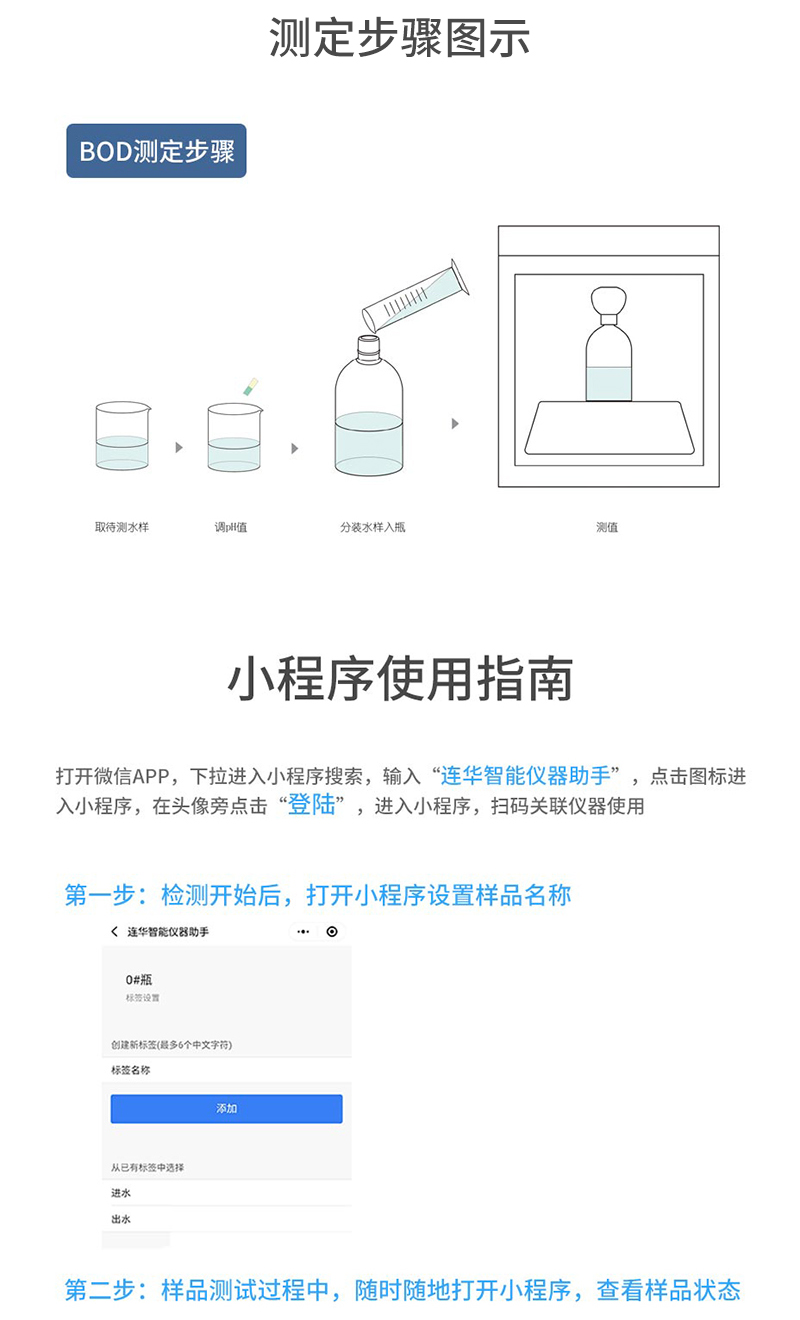 8、 操作簡便:只需要簡單的按鍵即可完成設(shè)置,按照量程設(shè)置的體積數(shù)將水樣裝瓶,即可進(jìn)行實(shí)驗(yàn);