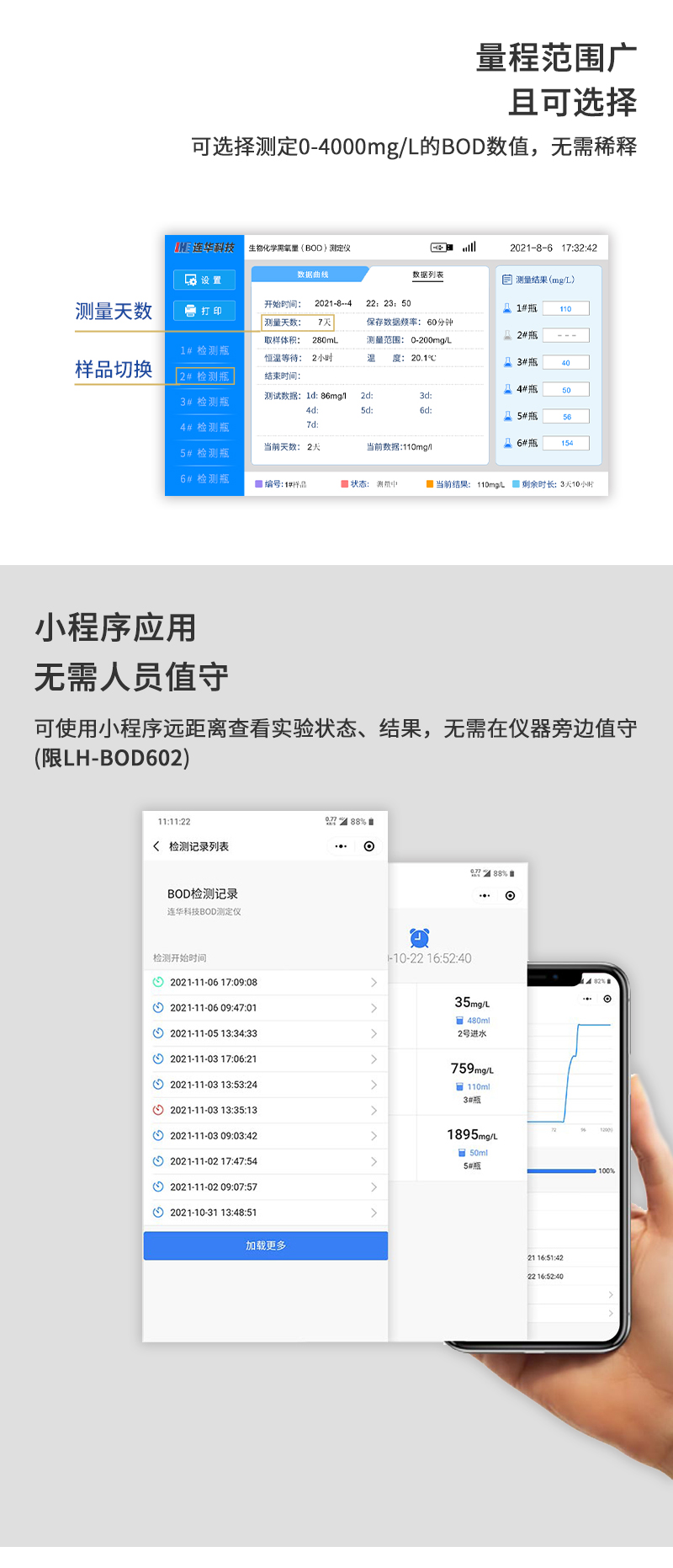 12、 小程序功能:小程序支持儀器管理、水樣命名、用戶管理等實(shí)用功能;